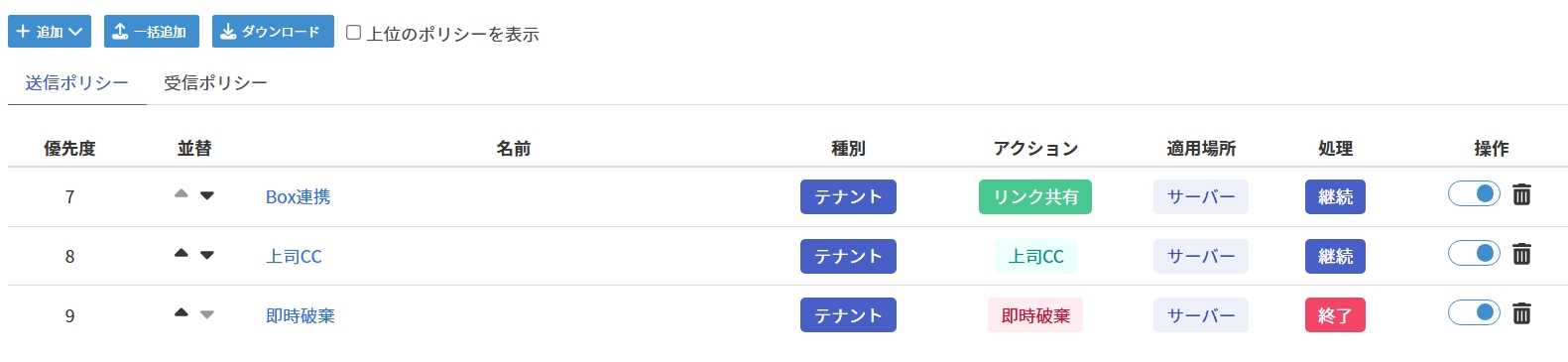 送信ポリシータブでは送信ポリシーが表示されます。